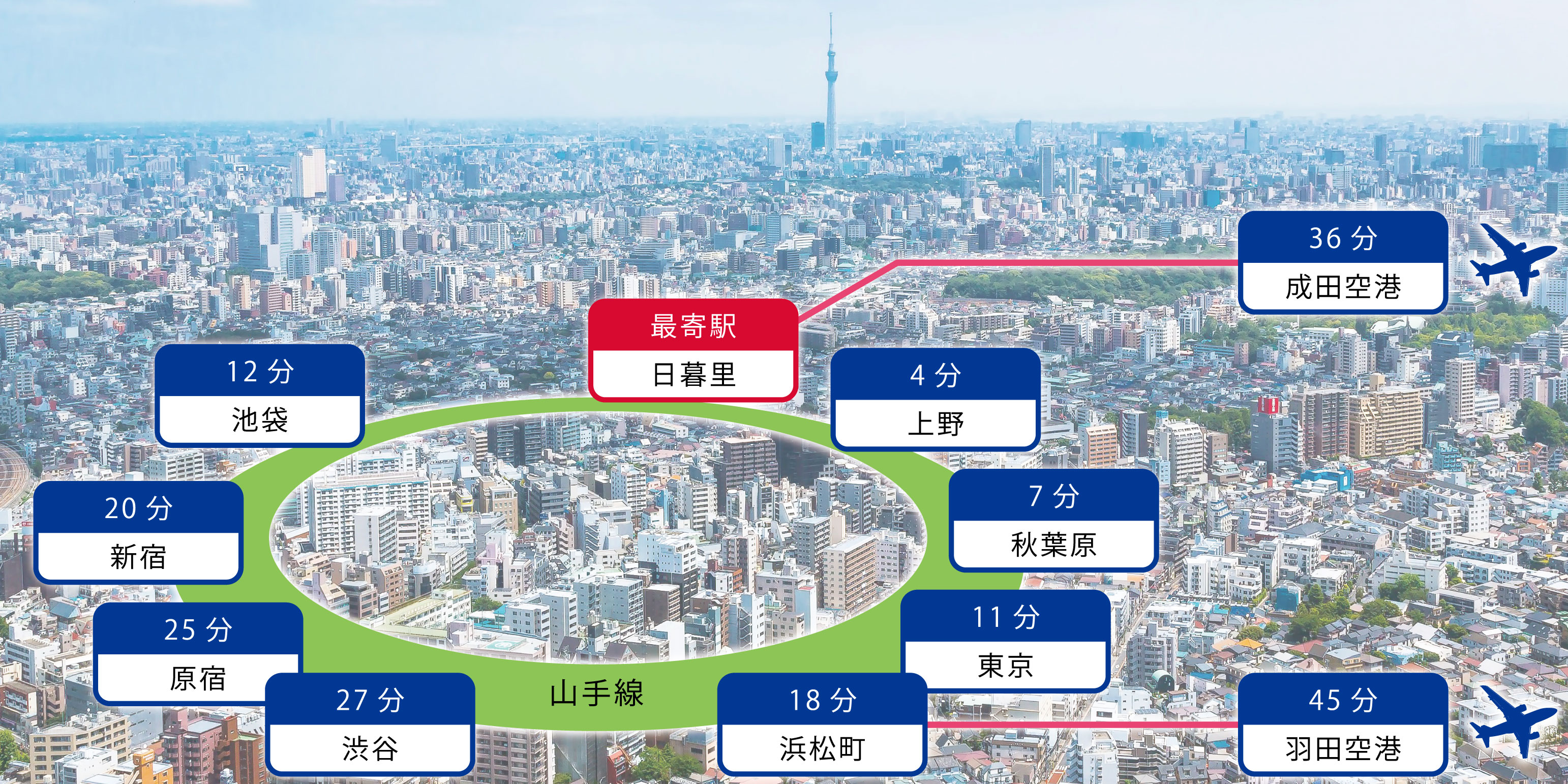 最寄の日暮里駅は、JR、京成本線、日暮里・舎人ライナーが乗り入れ、都心へも、郊外へもアクセスしやすい駅です。京成スカイライナーを利用すれば、日暮里から成田空港まで36分で移動ができます。