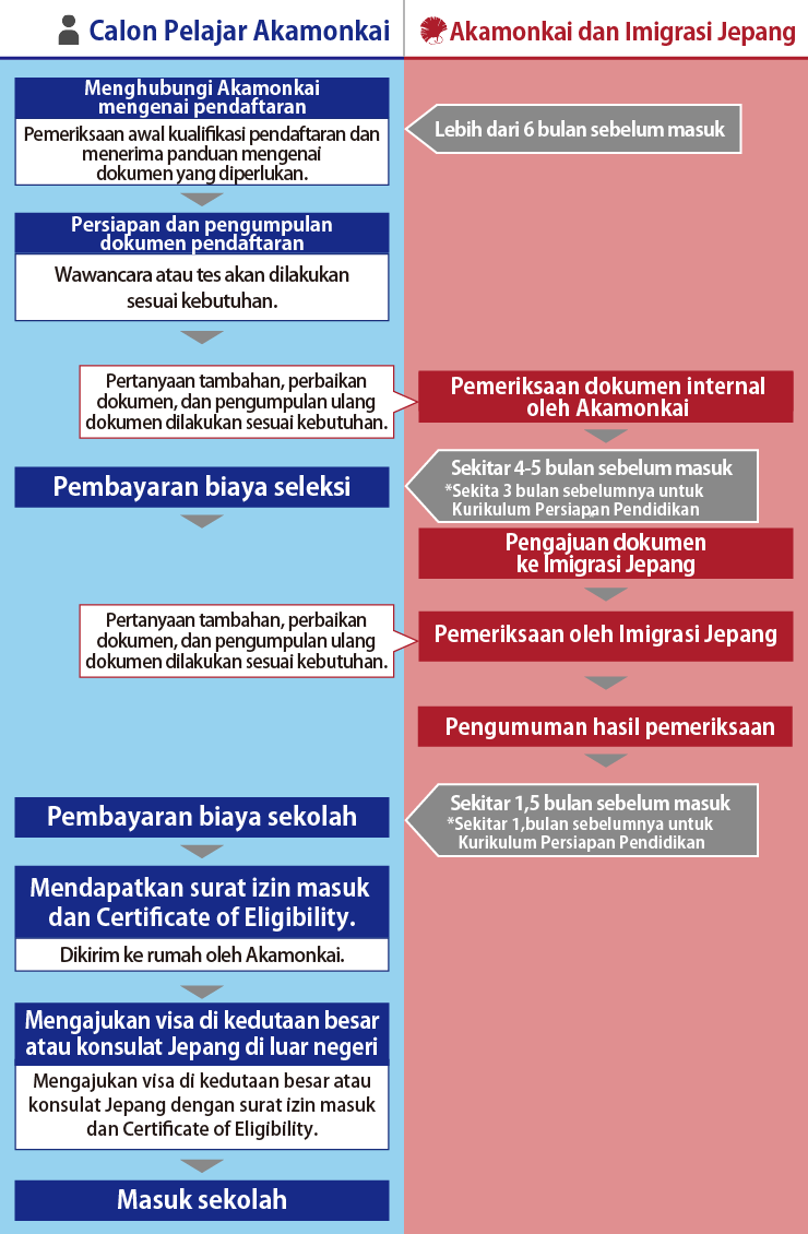 Untuk program yang memerlukan visa pelajar, seluruh dokumen pendaftaran harus diserahkan 4 hingga 5 bulan sebelum masuk sekolah.