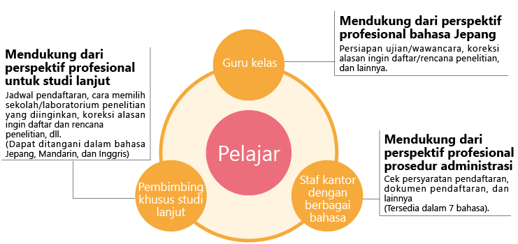 Berdasarkan pengalaman dan data yang beragam, guru kelas, pembimbing khusus studi lanjut, dan staf kantor dengan berbagai bahasa membimbing pelajar secara individu agar dapat studi lanjut ke sekolah tinggi kejuruan, sarjana, atau pascasarjana yang paling sesuai untuk setiap pelajar.