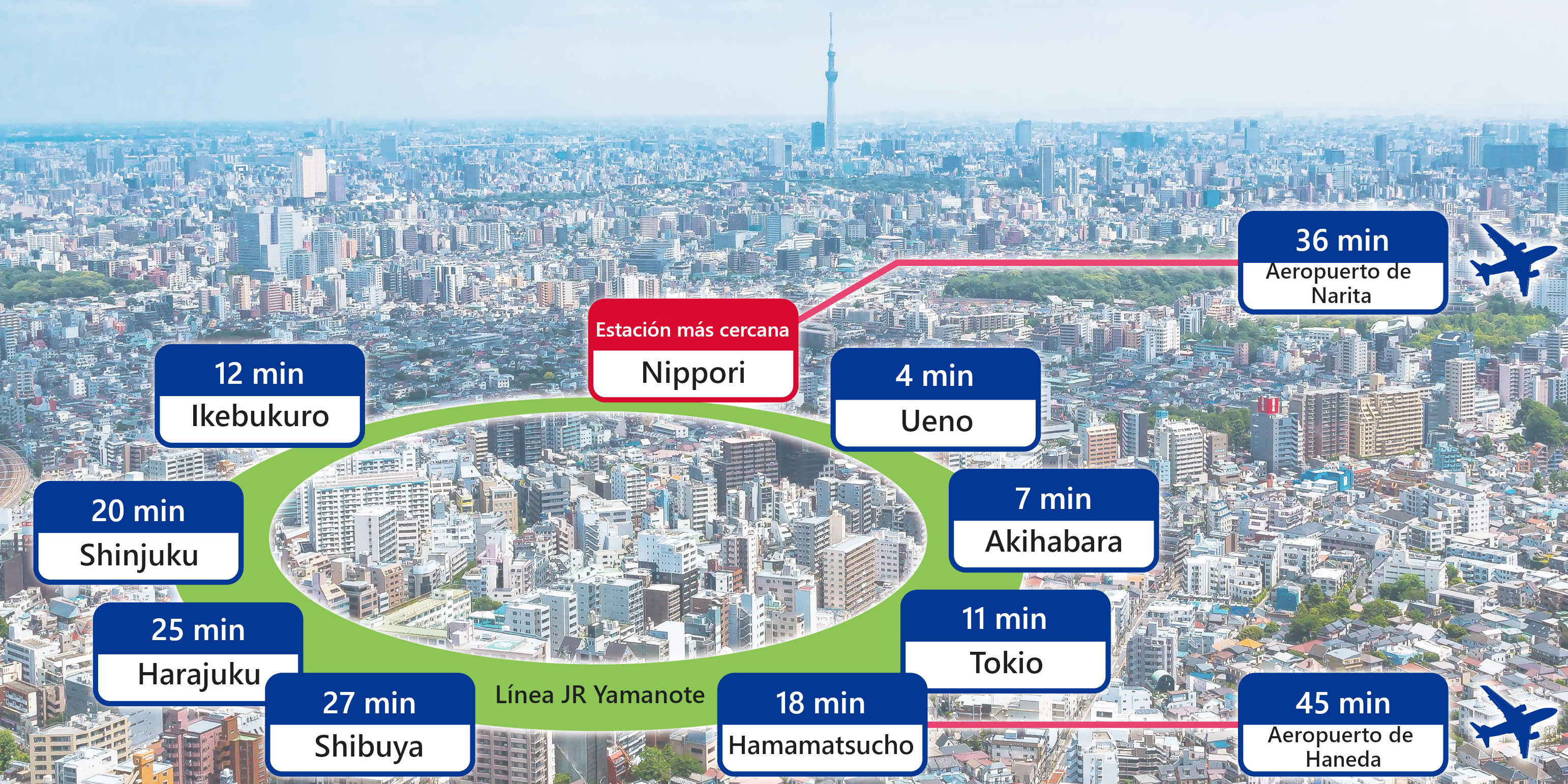 La estación más cercana, Nippori, cuenta con conexiones directas a través de las líneas JR, Keisei Main Line y la línea Nippori-Toneri Liner, lo que permite un excelente acceso tanto al centro de Tokio como a las zonas suburbanas. Utilizando el Keisei Skyliner, se puede llegar al Aeropuerto de Narita desde Nippori en solo 36 minutos.