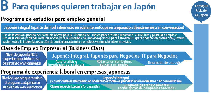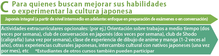 Los alumnos adquieren progresivamente habilidades de japonés equivalentes al nivel N2, con un enfoque especial en mejorar la expresión oral ("output"). A la vez, desarrollan habilidades prácticas de comprensión auditiva y lectora. De esta forma, adquieren un dominio del idioma útil tanto para la comunicación diaria como para la búsqueda de empleo en Japón.