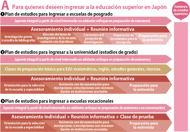 En el nivel inicial los alumnos tienen como objetivo desarrollar de forma balanceada las cuatro habilidades: leer, escribir, hablar y escuchar, con el fin de adquirir un dominio del japonés aplicable a diversas situaciones. A partir del nivel intermedio, según los objetivos de cada estudiante, contamos con un plan de estudios enfocado en la preparación de exámenes o un currículo de japonés integral.