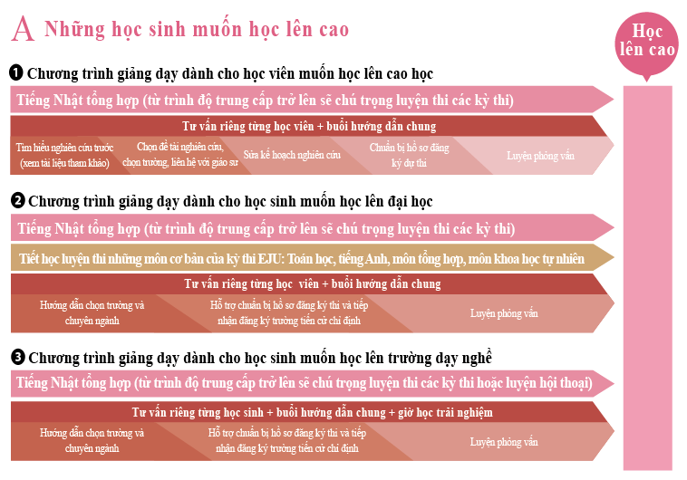 Sử dụng các tập đề luyện để giúp học viên ôn thi năng lực tiếng Nhật (JLPT) và môn tiếng Nhật trong kỳ thi du học Nhật Bản (EJU).(Trung cấp1ôn thi N2、trung cấp3ôn thi N1、trung cấp2trở lên ôn thi tiếng Nhật trong kỳ thi EJU). Vì kỳ thi EJU có phần viết luận nên các thầy cô cũng hướng dẫn cách viết luận. Những học viên không dự thi đại học thì việc ôn luyện cũng sẽ giúp học viên có thêm kiến thức và khả năg viết luận tốt hơn.