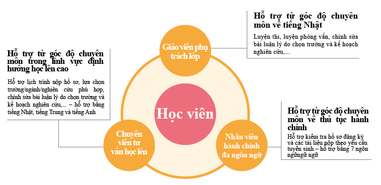 Dựa trên thông tin và kinh nghiệm thực tiễn phong phú, giáo viên phụ trách lớp, chuyên viên tư vấn học lên cao và nhân viên hành chính đa ngôn ngữ sẽ phối hợp hướng dẫn từng học viên để có thể lựa chọn được trường đại học, cao học hoặc trường dạy nghề phù hợp nhất.